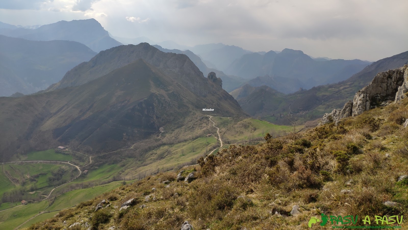 Hacemos una corta parada nada más salir, para disfrutar de lo que dejamos a nuestras espaldas. Será una buena idea, ya que el día se fue cerrando y no lograremos una panorámica tan limpia en toda la jornada. Lo que veis es la zona del Macizo del Cornión, con la Torre de Santa María de Enol en lo más alto.